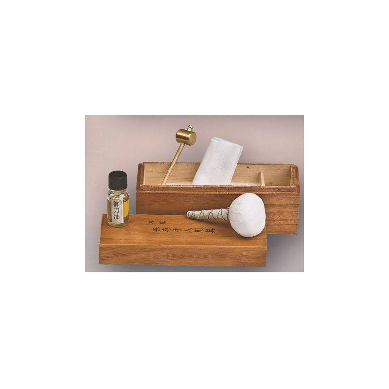 <p> - Reinigungsset für Katanas.<br /> - Präsentiert in einer Holzkiste.<br /> - Inklusive Metallhammer (Mekugi).<br /> - Inklusive feinem Reinigungstuch (erufu).<br /> - Enthält Pflanzenöl (Koji) zum Einfetten.<br /> - Mit Reispapier (Harai Gami) und einer Kugel aus nicht scheuerndem Pulver (Uchiko).</p>