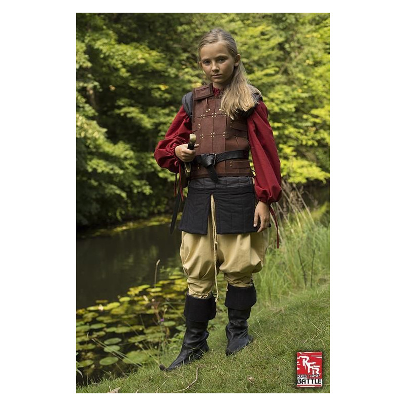 Die Rüstung besteht aus länglichem schwarzem Leder, das aus chromgegerbtem Leder geschnitten und mit Messingnieten über weichem Leder genietet ist. Mit verlängerten Seiten zum Schutz der Seiten sind die Vorder- und Rückplatten mit robusten Lederriemen und Eisenschnallen gesichert.