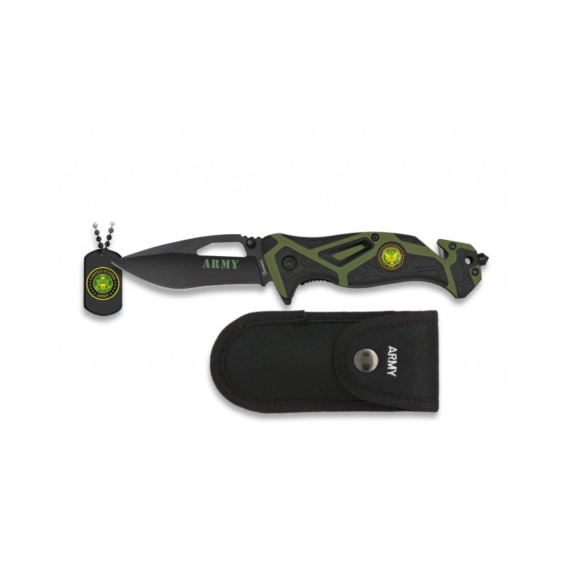 Mod. Regist. ©<br />Marke: ALBAINOX<br />ARMY Taktisches Messer<br />Griff: Aluminium<br />Blende: FOS<br />Klinge: Edelstahl<br />Klingengröße: 8,4 cm<br />Büroklammer<br />Glasbrecher-Spitze<br />Doppeltes Schneidband<br />Zahnbelag<br />Nylon-Scheide