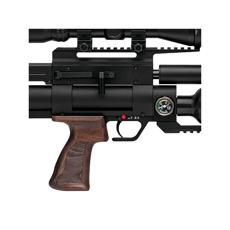 <p> 600-mm-Lauf mit eingebautem Sound-Moderator.</p> <p> Zylinderkopf mit Magazinhaltersystem und Backenstück im Lieferumfang enthalten.</p> <p> Die Luftflasche hat einen maximalen Betriebsdruck von 300 bar und kann bis zu 500 cm³ Luft aufnehmen. Der Zylinder besteht aus Kohlefaser.</p> <p> Dieses Modell ist mit einem Druckregler ausgestattet, der bei jedem Schuss eine gleichbleibende Leistung und Geschwindigkeit gewährleistet. Manometer im Lieferumfang enthalten, befindet sich auf der rechten Seite.</p> <p> 22mm Weaver Schiene</p> <p> Die manuelle Sicherung befindet sich oberhalb des Abzugsbügels.</p> <p> Die brandneue Anzeige zeigt an, dass die Waffe geladen ist.</p> <p> Neues Betätigungssystem mit umschaltbarem Seitenhebel, das eine reibungslose Aktion beim Zusammenbau der Waffe ermöglicht.</p> <p> Kaltgespannter Lauf mit 1/2 UNF-Gewinde.</p> <p> Aufnahmesystem, Multi-Shot. Einstellbarer Zweitakt-Abzug.</p> <p> Einstellbare Leistung</p> <p> Manuelle Sperre (PIN-System)</p> <p> Gesamtlänge: 840 mm (33,1 Zoll)</p> <p> Gewicht ohne Sucher: 3,8 kg (8,3 lb)</p> <p> Der Karabiner wird mit zwei Multi-Shot-Magazinen mit einer Kapazität von 14 Schuss pro Magazin, einem Ladeanschluss und einem O-Ring-Kit geliefert.</p>