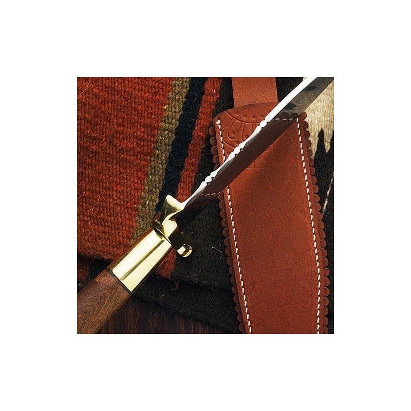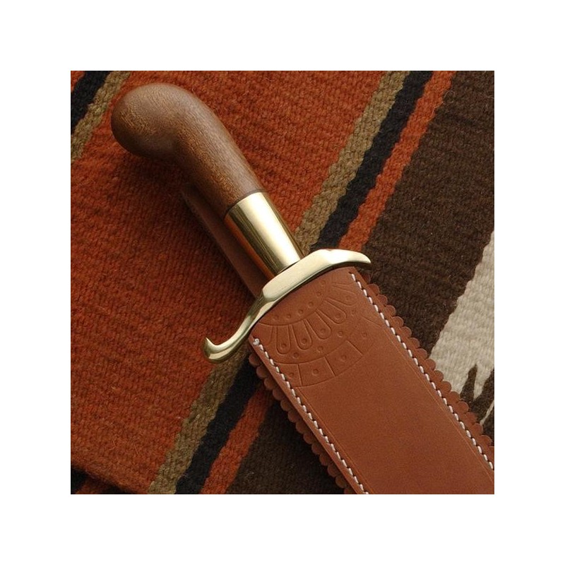 Der mexikanische Bowie hat ein exklusives Design, das sehr effektiv ist. Das Original dieses Bowie befindet sich in einer Privatsammlung. Gewiß konnte man ihn im Gürtel des Generals Santa Anna bei einer tapferen Aktion an der Grenze sehen. Er hat eine handgeschmiedete Klinge aus kohlenstoffreichem Stahl, 1085. Vollzapfenklinge mit einer einzigartigen und exklusiven Form mit Kerben an der Schneide. Handgefertigter Griff aus Massivholz mit einem Handschutz aus Messing. Bequem und leicht. Ein Muss für jeden Sammler.