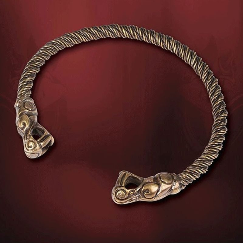 Der Torc oder Torque, eine starre, runde, vorne offene Halskette, ist in vielen alten Zivilisationen zu finden und wurde sowohl von Männern als auch von Frauen getragen. Diese nachgebildeten Halsringe stammen aus der Zeit der alten Kelten und Wikinger. Jedes ist aus halbflexiblem Material handgefertigt, was eine einfache Anpassung ermöglicht.<br /><br />Die Enden der Halskette zeigen wilde Drachenköpfe.<br /><br />Maße ca. 53 cm im Umfang.