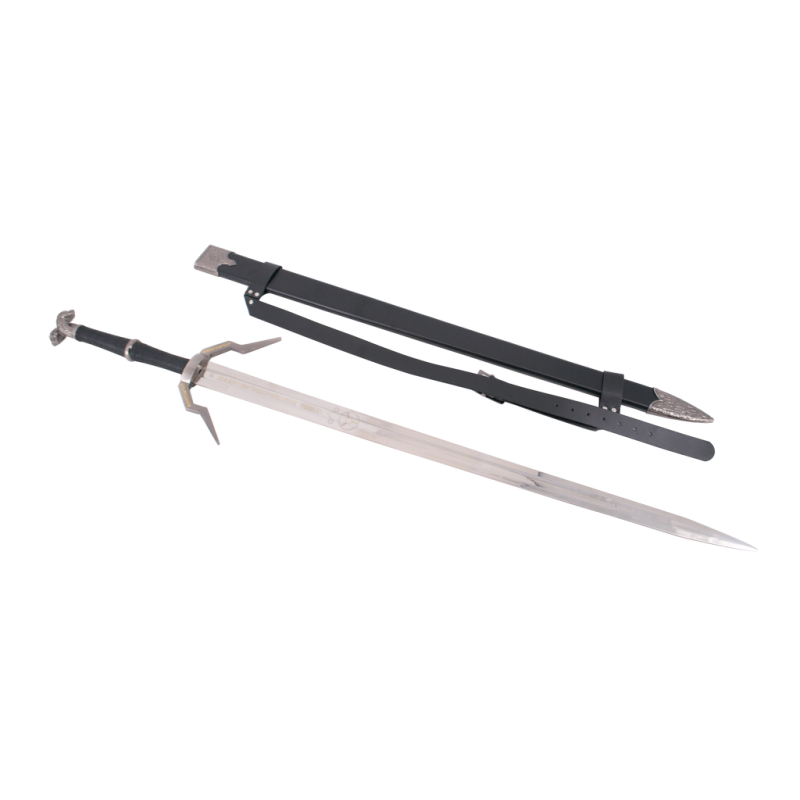 Schwert S3317 Modell Geralt de Riva (The Witcher), Inoffizielle Replik, mit einer Gesamtgröße von 127,5 cm, Stahlklinge und schwarzer Lederscheide, Klinge und Schild mit Runen graviert. Nr. S3317