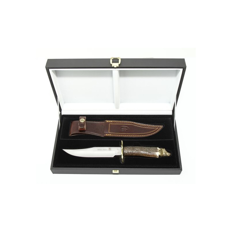 - Klingenlänge: 16 cm - Hirschgeweih-Manschette - Messing-Kotflügel - Wolfskopf-Knopf - Klinge aus rostfreiem Stahl