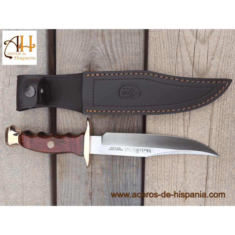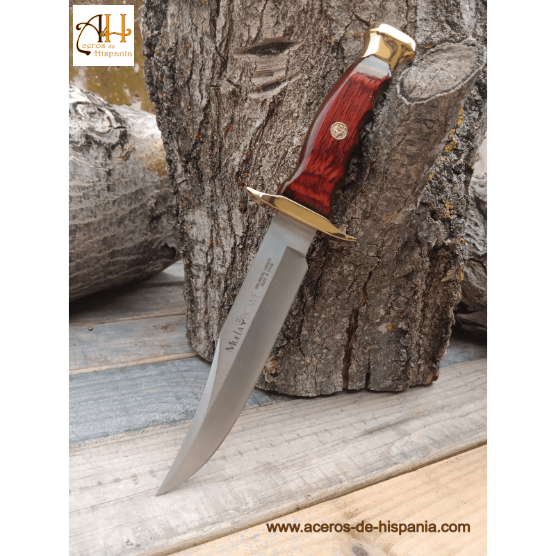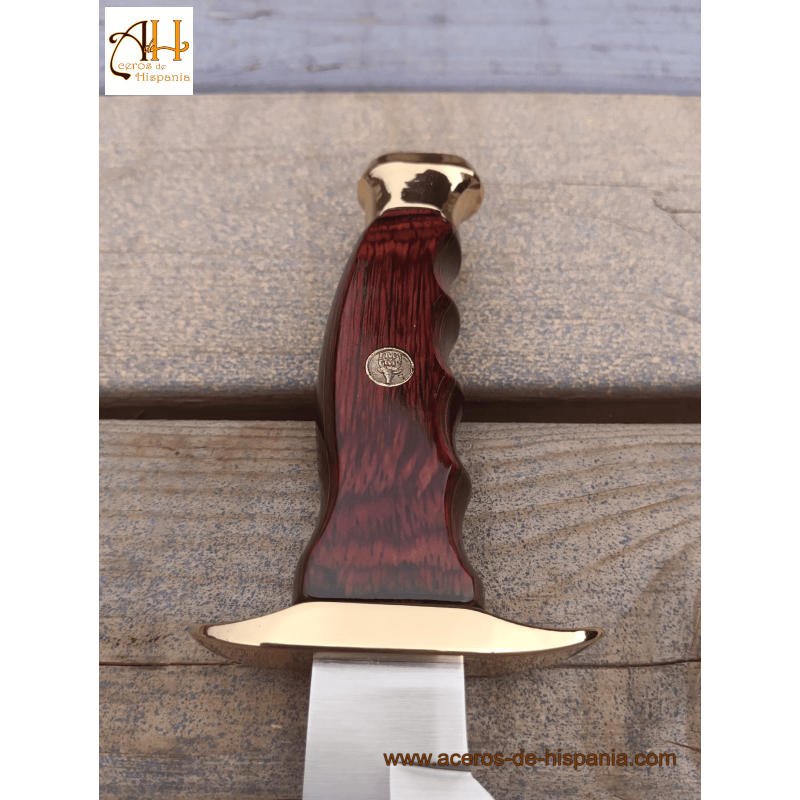 Bowie-Messer dieses Messermodell ist für die Jagd oder die Verteidigung, es hat eine Clip-Spitze, die das Ende der Klinge konkav macht. Diese Bowie-Messer haben in der Regel große und sehr scharfe Klingen. Der Griff dieses Bowiemessers von Muela ist aus gepresstem Korallenholz gefertigt, sein Parierelement und der Knauf sind aus Messing. Es hat eine 16 Zentimeter lange Klinge. Bowie-Messer aus Spanien.
