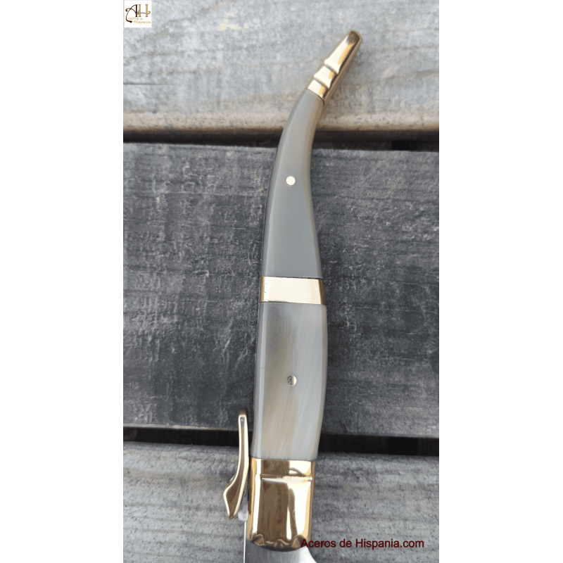 Die Curro-T Kollektion Muela Messer in reiner Handwerkskunst mit Horn und Messingschalen, mit einer Länge von 15 cm. Klingen-Verriegelungssystem. Sie hat eine Klingenlänge von 12,5 cm aus Molybdän-Vanadium-Stahl. Er ist mit einem Gewicht von 160 Gramm sehr leicht. Die Messer Muela in Spanien hergestellt.