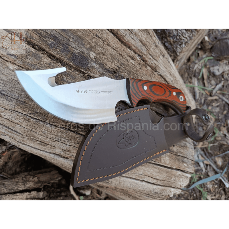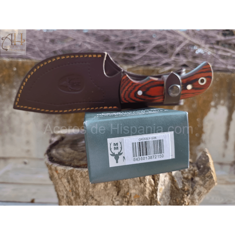 Messer Muela für die Jagd. Das Modell Grizzly 12R hat eine 17 cm lange Klinge. Die Klinge besteht aus massivem 440c-Stahl, dieser 440c-Stahl ist ein rostfreier Stahl, der eine hohe Verschleißfestigkeit aufweist. Der Griff hat eine Länge von 11,5 cm mit laminierten roten Holzschuppen.