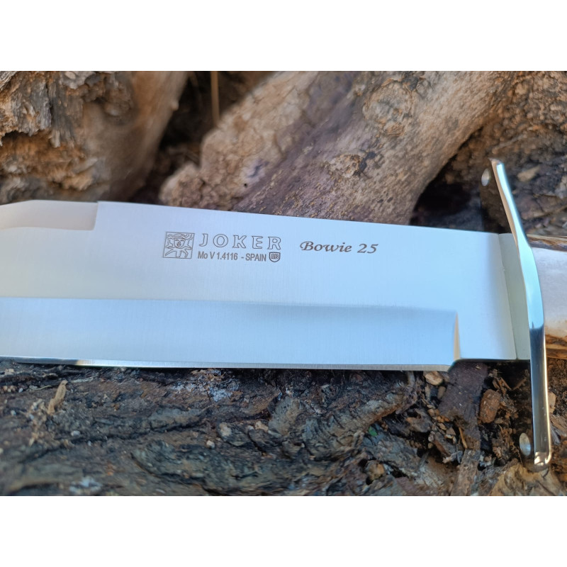 Bowie Jagd- und Sportmesser der Marke Joker. Sie hat eine 25 Zentimeter lange Klinge aus Edelstahl MOVA 1.4116, satiniert, 5 cm Klingenbreite und Clip-Tip-Klingenfinish. Abgerundet wird der Zauberer mit einer Hirschkronenmanschette mit einer Länge von 13,5 Zentimetern. Die Gesamtmaße des Bowie-Messers betragen 38 Zentimeter und wiegen 525 Gramm. Dieses Messer wurde in Albacete (Spanien) entwickelt und hergestellt