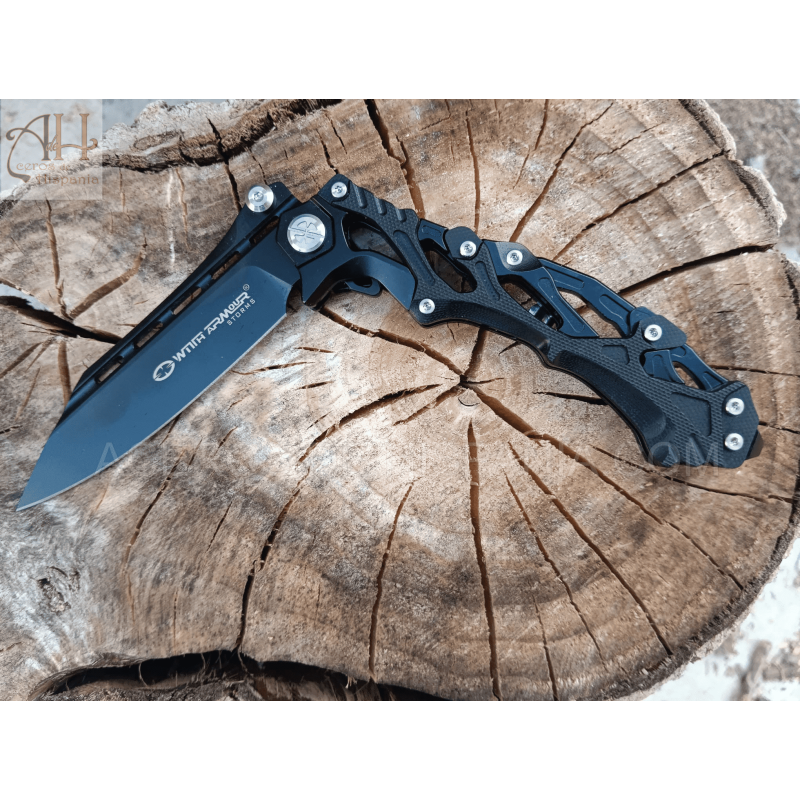 Mit Rüstung taktische Taschenmesser. Er hat eine Klinge von 10,10 cm und eine Dicke von 3 mm. Stahl Typ D2 mit schwarzer Antireflexbeschichtung. Er hat einen Griff aus Edelstahl und ist 13,30 cm lang. Die Gesamtlänge des Messers beträgt 23,40 Zentimeter. Es ist sehr leicht und wiegt 150 Gramm.