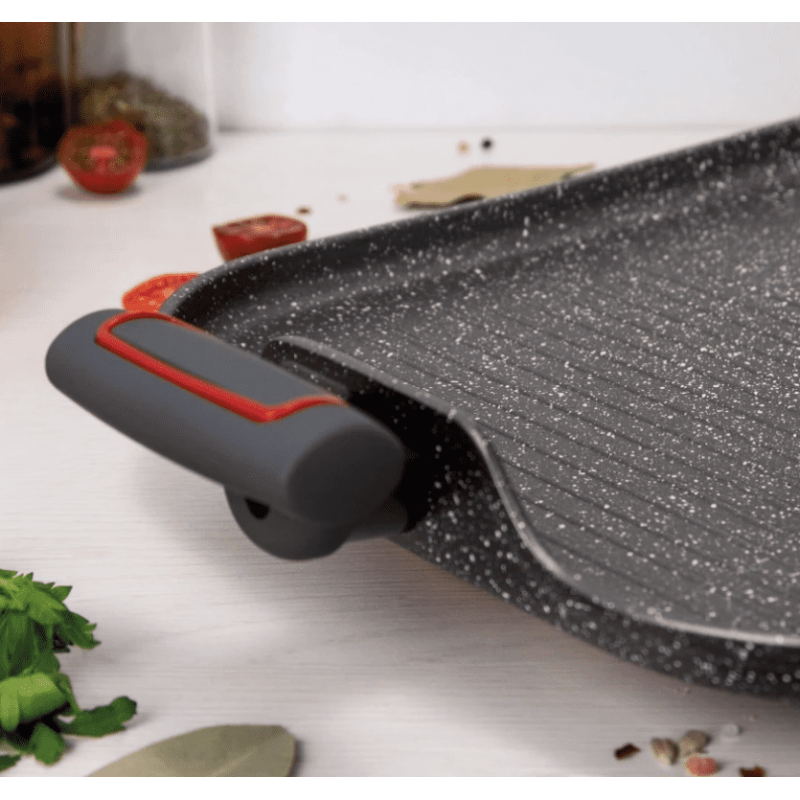 <p>Entdecken Sie die Revolution in der Küche mit unserem Grill <strong>35,5 x 28,3 x 1,3 cm</strong> aus der Grey-Kollektion der Marke 3 Claveles. </p> <p>Steigern Sie Ihr kulinarisches Erlebnis und verleihen Sie Ihren Gerichten eine Gourmet-Note! Entdecken Sie die Magie der Zubereitung von Gemüse, Fleisch und Fisch mit dieser unglaublichen Grillplatte mit Steineffekt.</p> <p> <p>Hergestellt aus hochwertigem geschmiedetem Aluminium, sorgt es für <strong>eine gleichmäßige Wärmeverteilung, ist stark und langlebig.</strong></p> <p> <p><strong>Titanverstärkte dreilagige Antihaftbeschichtung</strong>. Diese fortschrittliche QuanTanium-Beschichtung erleichtert das Kochen und Reinigen.</p> <p> <p>Es ist für alle Kochfelder geeignet, einschließlich <strong>Induktion, Cerankochfeld, Gas und Elektro</strong>. Bereiten Sie Ihre Lieblingsgerichte in völliger Freiheit und ohne Einschränkungen zu!</p> <p> <p>Dank seiner außergewöhnlichen Wärmespeicherung gart dieser 3 claveles Grill Ihre Speisen <strong>gleichmäßig und spart Energie</strong>, sodass Sie effizienter kochen können.</p> <p> <p>Mit 2,8 mm Wänden, 4,0 mm Rand, 4 mm Boden und 3,0 mm Scheibe ist diese Pfanne so konzipiert, <strong>dass sie den Test der Zeit besteht</strong>.</p> <p>Die <strong>hitzebeständigen Silikongriffe</strong> sorgen für einen <strong>sicheren und bequemen Halt</strong> und sorgen dafür, dass Sie sicher und sorgenfrei kochen können.</p> <p>Es ist<strong> PFOA-frei</strong> und stellt sicher, dass Ihre Mahlzeiten für Sie und Ihre Familie gesund und sicher sind.</p> <p> <p>Mit den Maßen <strong>35,5 cm x 28,3 cm x 1,3 cm</strong> ist diese Grillplatte die perfekte Ergänzung für Ihre Küche. Sein <strong>kompaktes und schlankes Design</strong> erleichtert die Aufbewahrung und verleiht Ihrem Essbereich einen Hauch von Modernität.</p>