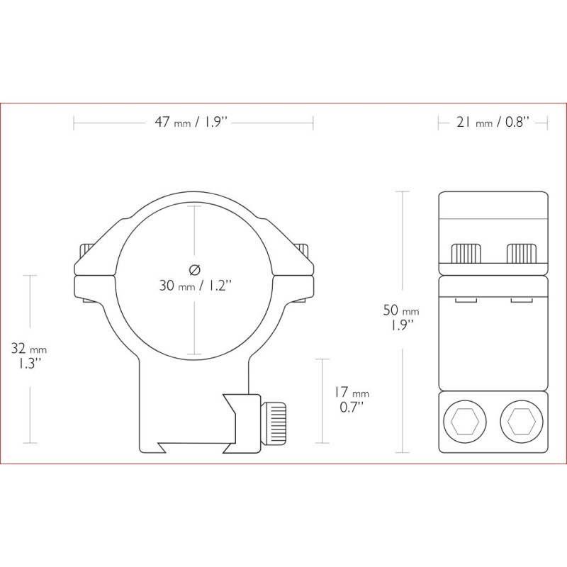 <p>Großes Modell</p> <p>Ringgröße (Durchmesser) 30mm</p> <p>Schiene 9-11 mm / 3⁄8"</p> <p>2-teilige Konfiguration</p> <p>Bindungen (oben) Doppelsechskant (3 mm)</p> <p>Gewinde (oben) 8-32</p> <p>Bindungen (Schiene) Doppelsechskant (4mm)</p> <p>Gewinde (Schiene) M5x0,8</p> <p>Innenkissen Ja</p> <p>Einziehbarer Rückstoß-Anschlagstift Ja</p> <p>Höhe 2" 50mm</p> <p>Gewicht: 3,6 Unzen, 102 g</p>
