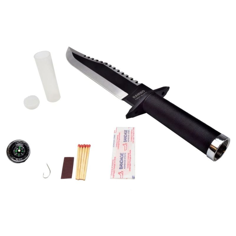 <p> <p><span style="color:#000000;">Rambo-Messer, das Rambo II Messer ist ein Jagd- und Überlebensmesser.</span></p> <p><span style="text-decoration:underline;color:#000000;"><strong>Rambo II Messer Eigenschaften:</strong></span></p> <p><span style="color:#000000;">LÄNGE DER STAHLKLINGE 250 mm</span></p> <p><span style="color:#000000;">CORDURA-BESCHICHTETER METALLGRIFF</span></p> <p><span style="color:#000000;">MINI SURVIVAL KIT MIT INNENGRIFF MIT:</span></p> <p><span style="color:#000000;"> -KOMPASS</span></p> <p><span style="color:#000000;"> - ANGELHAKEN</span></p> <p><span style="color:#000000;"> - 5x STREICHHÖLZER</span></p> <p> <p><span style="color:#000000;">KUNSTLEDERSCHEIDE MIT GÜRTELNADEL</span></p> <p><span style="color:#000000;">GESAMTLÄNGE 400 mm (415 mm MIT KETTENSTREBE)</span></p> <p><span style="color:#000000;">GEWICHT 560 g (650 g MIT POD)</span></p>