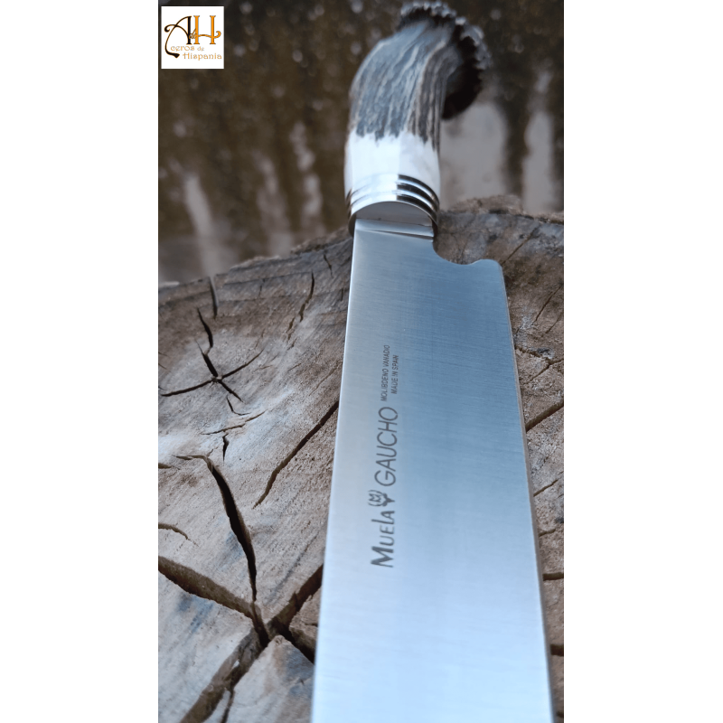 - Griff aus Hirschgeweih: Er besteht aus Hirschgeweih und bietet eine natürliche Textur, die mit einer dekorativen Rosette gekrönt ist, die mit dem Muela-Logo gekrönt ist und Komfort und Eleganz garantiert.