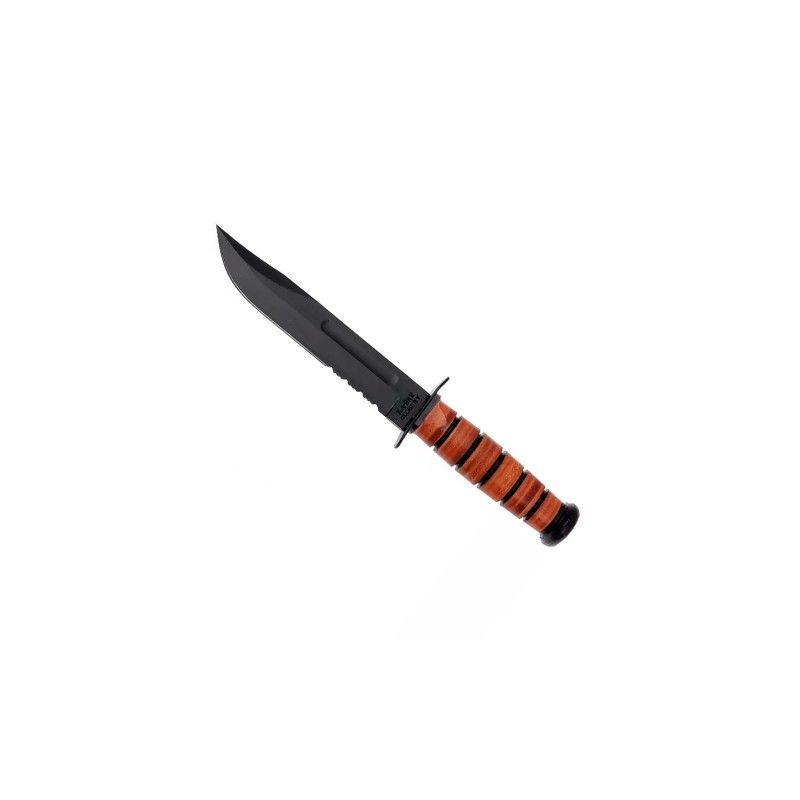 <p>Das Kumc Fighting/Utility 1218 Ka-Bar Messer ist die Version des legendären 1217 Messers mit einer gemischten Schneide: glatt/gezahnt. <br />Es ist ein Messer, das 1942 als Überlebensexemplar für die Marines ausgewählt wurde und seitdem jahrzehntelang ein sehr zuverlässiges Kampfwerkzeug ist. <br />Die Klinge mit getrimmter Spitze besteht aus 1095 Cro-Van-Stahl, der eine hervorragende Härte bietet. <br />Der Stahl ist nicht rostfrei, enthält aber eine schwarze Beschichtung, um seine Lebensdauer zu verlängern.<br />Die Steifigkeit des Knopfes ermöglicht es, ihn als Hammer zu verwenden.<br />Griffigkeit des Griffs sehr gut dank der Lederringe.<br />Inklusive Lederetui mit dem Logo der U.S. Navy.</p>