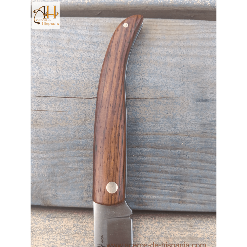 Taschenmesser Muela mit Cocobolo-Griffen, hat einen 13 cm langen Griff aus Cocobolo-Holz und genietet. Das Verschlusssystem ist ein Kolben. Er hat eine Gesamtlänge von 21,5 Zentimetern. Das Taschenmesser beinhaltet die Scheide.