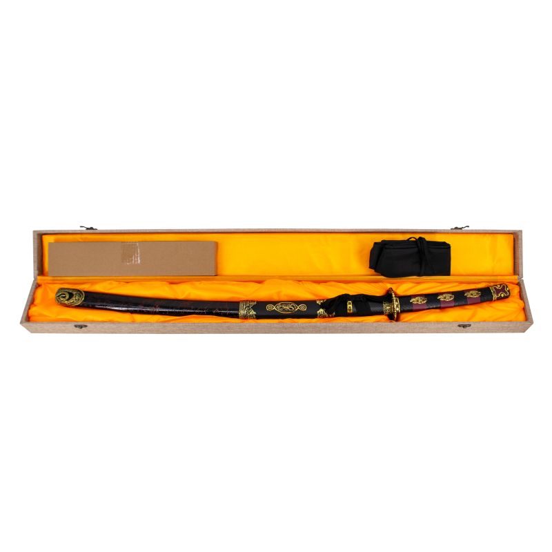 <p>Funktionelles Katana S2024H mit 101,5 cm Stahlklinge, schwarz lackierter Holzscheide mit roten Details und Schlangenlederimitat, Griff mit schwarzem Sepriente-Lederimitat und roten Kunstlederdetails. Mit Ständer.</p> <p><strong>Modell:</strong> Nr. S2024H<br /><strong>Gesamtgröße</strong>: 101,5 cm<br /><strong>Klingengröße</strong>: 70 cm<br /><strong>Klingenstärke</strong>: 5,6 mm<br /><strong>Griff</strong>: Kunstleder<br /><strong>Gewicht: </strong>1230 gr</p>