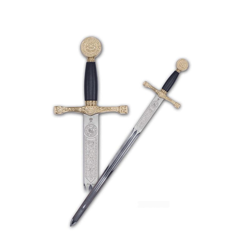 <p>Excalibur ist der Name des Schwertes von König Artus, der das Schwert aus dem Felsen entfernte, wie der Zauberer Merlin verkündete.</p> <p>Arthur schwor in Gegenwart aller Barone und des gemeinen Volkes feierlich, seinen Untertanen ein treuer König zu sein und Wahrheit und Gerechtigkeit an allen Tagen seines Lebens zu verteidigen.</p> <p><span style="text-decoration:underline;"><strong>Funktionen: </strong></span></p> <p>Details der Gravuren auf dem Griff mit Kontrasten.</p> <p>Manschette in Gold gehalten.</p> <p>Klinge aus rostfreiem Stahl. Warm.</p> <p>Gesamtlänge: 75 cm</p> <p>Klingenlänge: 60 cm</p>