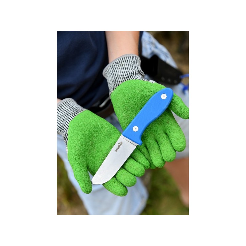 <p>UNU Schnitzel Messer, für Kinder, blau</p> <p></p> <p>- Klingenmaterial: 8Cr13Mov Edelstahl mit Stone Wash Finish </p> <p>- Griffmaterial: G-10 in Blau (auch in den Farben Grün, Orange-Rot und Pink erhältlich) </p> <p>- Gesamtlänge: ca. 17 cm </p> <p>- Klingenlänge: ca. 8 cm </p> <p>- Klingenstärke: ca. 3 mm </p> <p>- Grifflänge: ca. 9 cm </p> <p>- Griffstärke: ca. 14 mm </p> <p>- Inklusive Kydex-Etui (schwarz) </p> <p>- Gewicht: ca. 90 g (ca. 117 g mit Koffer) </p> <p></p>