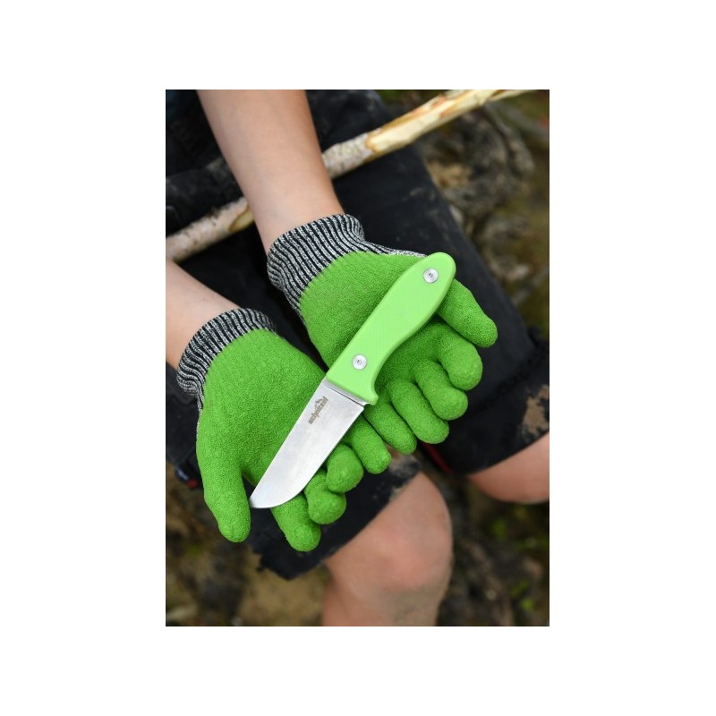 <p>UNU Schnitzel Messer, für Kinder, grün</p> <p></p> <p>- Klingenmaterial: 8Cr13Mov Edelstahl mit Stone Wash Finish </p> <p>- Griffmaterial: G-10 in grün (auch in blau, orange-rot und pink erhältlich)</p> <p>- Gesamtlänge: ca. 17 cm </p> <p>- Klingenlänge: ca. 8 cm </p> <p>- Klingenstärke: ca. 3 mm </p> <p>- Grifflänge: ca. 9 cm</p> <p>- Griffstärke: ca. 14 mm </p> <p>- Inklusive Kydex-Etui (schwarz) </p> <p>- Gewicht: ca. 90 g (ca. 117 g mit Koffer)</p>