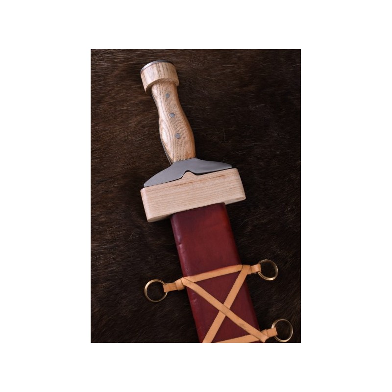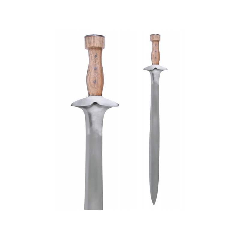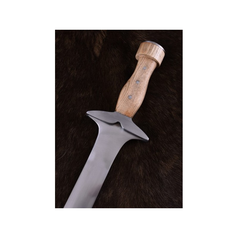 <p>Griechisch Xifos, Hoplitenschwert mit Scheide</p> <p></p> <p>- Material: Klinge aus Federstahl EN45 (Kohlenstoffstahl, nicht rostfrei), Holzgriff und Stahl </p> <p>- Gesamtlänge: ca. 68 cm </p> <p>- Klingenlänge: ca. 54 cm </p> <p>- Klingenstärke: ca. 4,5 mm / 4 mm (Schneiden ca. 1 mm) </p> <p>- Grifflänge: ca. 14 cm (Griffquerschnitt ca. 9 cm) </p> <p>- Klingenbreite: ca. 9 cm (am Vorsatzpapier) / 3,2 cm / 4,2 cm </p> <p>- Schwerpunkt: ca. 14 cm vor dem Parier </p> <p>- Inkl. Holzscheide mit Echtlederscheide </p> <p>- Gewicht ohne Scheide: ca. 0,95 kg </p> <p>- Gewicht mit Kettenstrebe: ca. 1,1 kg Die oben genannten Angaben können von Exemplar zu Exemplar leicht variieren. Der verwendete Stahl ist nicht rostfrei und kann leichte Korrosionserscheinungen aufweisen. Wir empfehlen eine regelmäßige Pflege der Klinge und der Scheide, zum Beispiel mit Ballistol, einem universellen Öl, das sich ideal zum Konservieren von Stahlutensilien eignet.</p> <p></p>