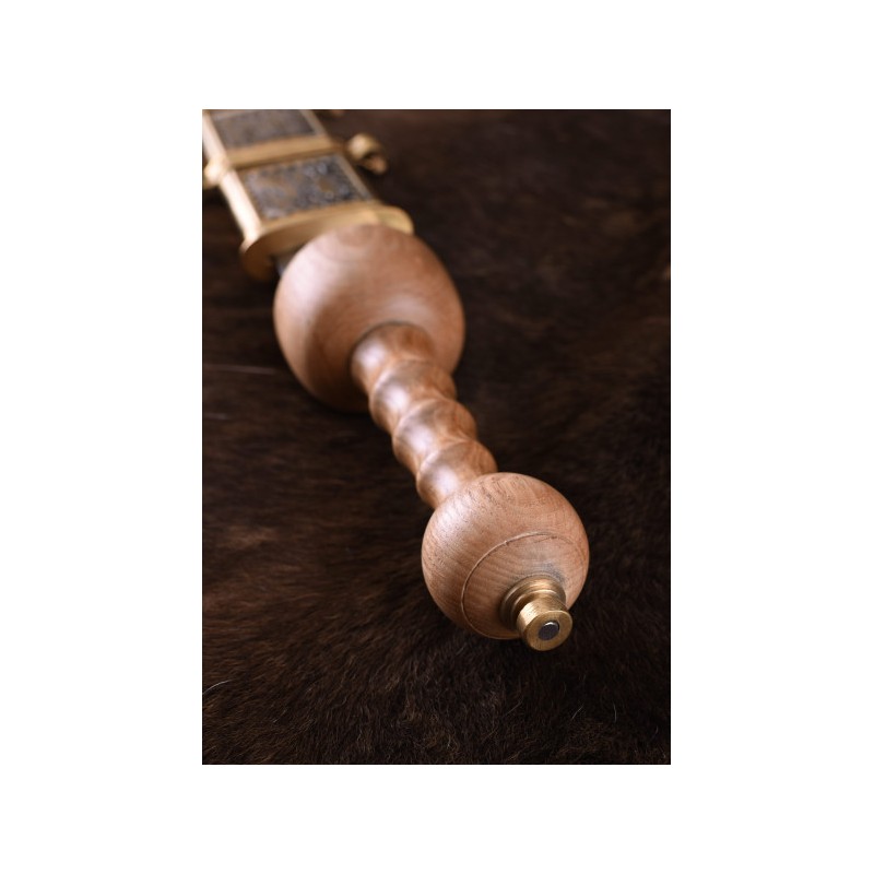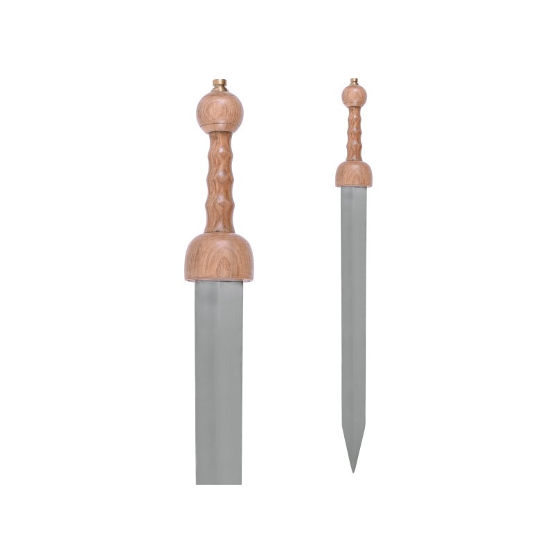 <p>Römischer pompejanischer gladius mit Scheide, 1. Jh.</p> <p></p> <p>- Material: Klinge aus Federstahl EN45 (Kohlenstoffstahl, nicht rostfrei), Holzgriff mit Klemmmutter aus Messing - Gesamtlänge: ca. 67,5 cm</p> <p>- Klingenlänge: ca. 49 cm</p> <p>- Klingenstärke: ca. 4,3 mm / 4 mm (Kanten ca. 1 mm)</p> <p>- Grifflänge: ca. 18,5 cm (Griffquerschnitt ca. 9 cm)</p> <p>- Maximale Klingenbreite: ca. 4,4 mm (Kanten ca. 1 mm). Klingenbreite: ca. 4,5 cm</p> <p>- Schwerpunkt: ca. 13 cm vor der Parierstange</p> <p>- Inklusive Holzscheide mit Scheide aus echtem Leder und Messingbeschlägen</p> <p>- Gewicht ohne Scheide: ca. 0,6 kg</p> <p>- Gewicht mit Scheide: ca. 0.95 kg Die oben genannten Spezifikationen können von Modell zu Modell leicht variieren. Der verwendete Stahl ist nicht rostfrei und kann leichte Korrosionserscheinungen aufweisen. Wir empfehlen eine regelmäßige Pflege der Klinge und der Scheide, zum Beispiel mit Ballistol, einem universellen Öl, das sich ideal zum Konservieren von Stahlutensilien eignet.</p>