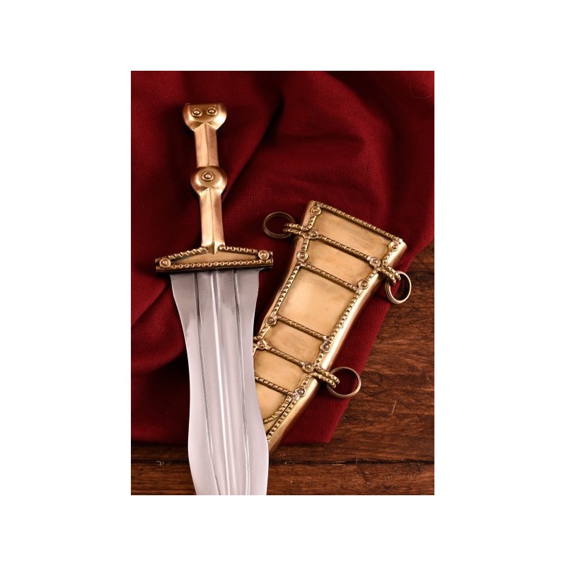 <p>Leween Pugio, Römischer Dolch</p> <p></p> <p>- Authentische Replik</p> <p>- Dolchscheide aus Messing</p> <p>- Klingenmaterial: EN45 Federstahl</p> <p>- Gesamtlänge: ca. 37,5 cm</p> <p>- Klingenlänge: ca. ca. 25 cm</p> <p>- Grifflänge: ca. ca. 12,5 cm</p> <p>- Gewicht: ca. 350 g Die oben genannten Angaben können von Artikel zu Artikel leicht variieren.</p>