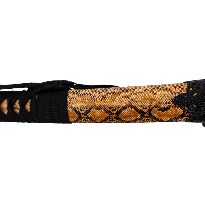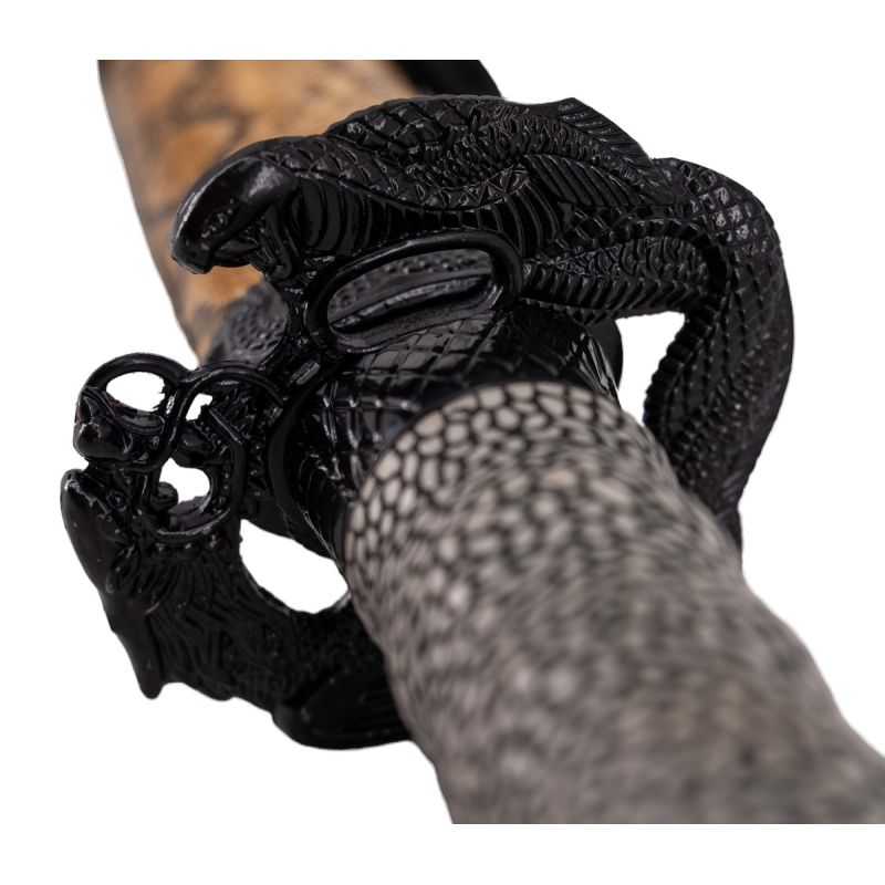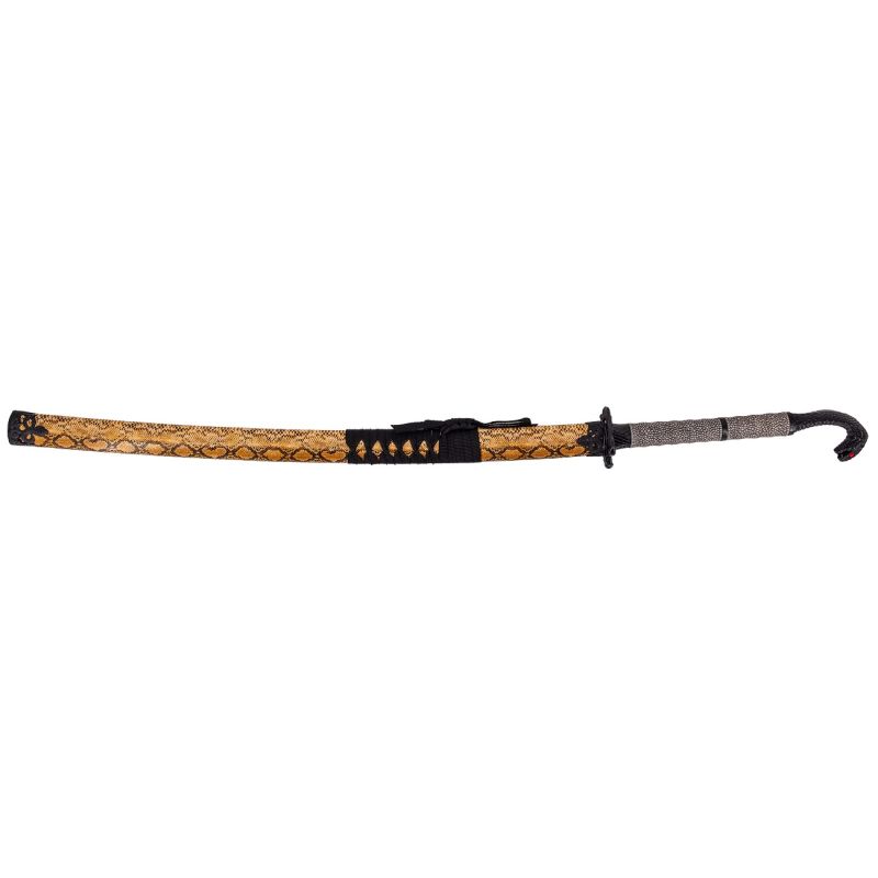 Schwarze Cobra Katana S2032 von 108 cm Klinge aus poliertem Stahl, Griff mit Schlangenlederimitat und Knauf in Form einer Kobra in Schwarz mit roten Augen, Gehäuse mit schwarzen Metallankern und schwarzem Cordura mit der Scheide aus Schlangenlederimitat.