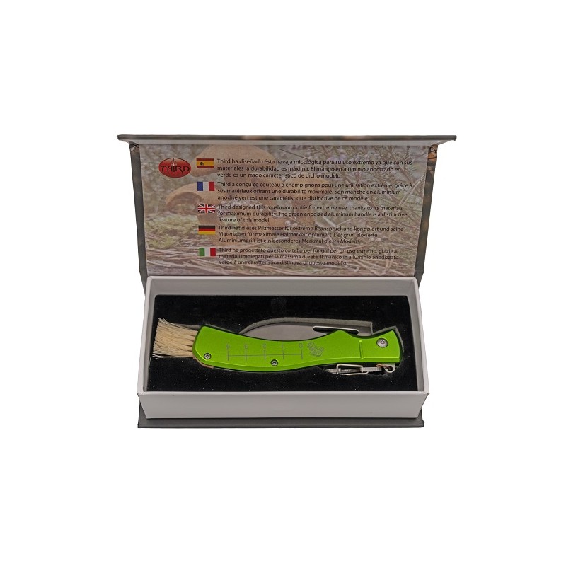 <p>Mykologisches Messer Third N207, grün eloxierter Aluminiumgriff mit Pilz- und Borcha-Messgerät und Zeichnung. Er hat eine 8,2 cm große 420-Stahlklinge mit Satin-Finish und einem Clip. Mit Präsentationsbox.</p> <p><strong>Handle:</strong> Aluminium<br /><strong>Blatt:</strong> Stahl 420<br /><strong>Klingengröße:</strong> 8,2 cm<br /><strong>Klingendicke:</strong> 3 mm<br /><strong>Schnitt-cm:</strong> 7,8 cm<br /><strong>Griffgröße:</strong> 11,7 cm<br /><strong>Gesamtlänge:</strong> 19,9 cm<br /><strong>Gewicht:</strong> 84 gr</p>