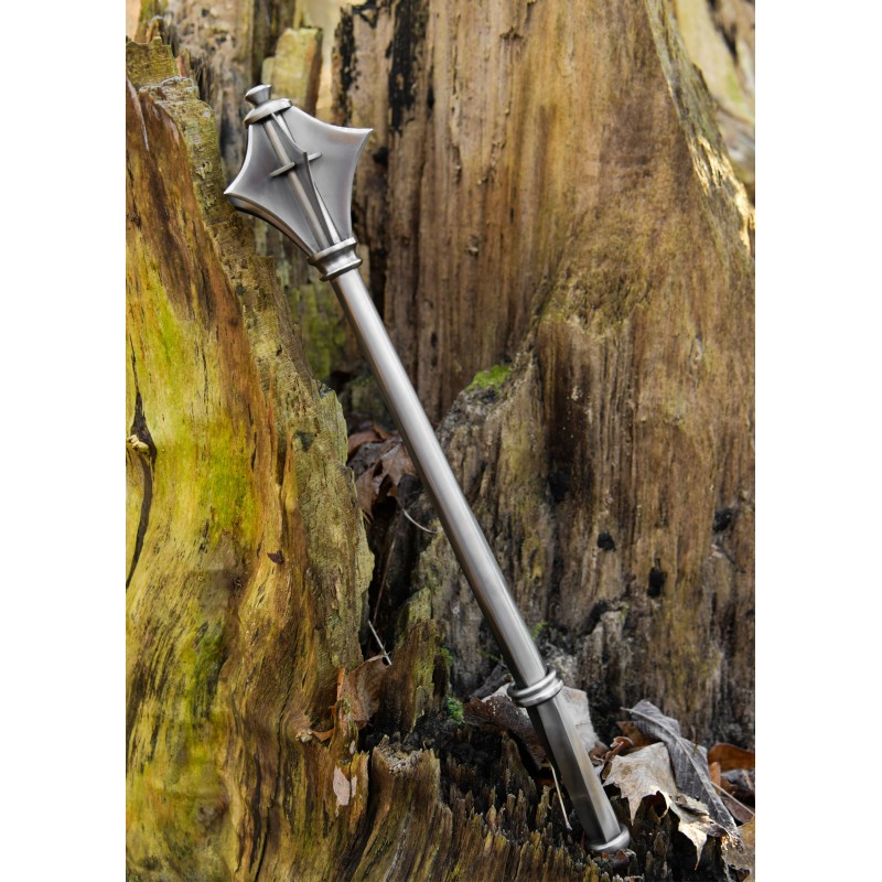 <p>Wunderschöne Nachbildung einer mittelalterlichen Keule. </p> <p>Diese Keulen wurden sowohl von Infanterie als auch von Kavallerie als Waffen verwendet.</p> <p>Keulen waren sehr effektiv gegen Plattenrüstungen, wurden aber von den höheren sozialen Schichten verachtet. </p> <p>Dieser sechszackige Hammer besteht vollständig aus Stahl.</p> <p>Das Original dieser Nachbildung ist derzeit im British Museum in London ausgestellt. </p> <p>Material: Stahl, leicht geölt.</p> <p>Länge: ca. 54 cm.</p> <p>Gewicht: ca. 1,1 kg.</p>