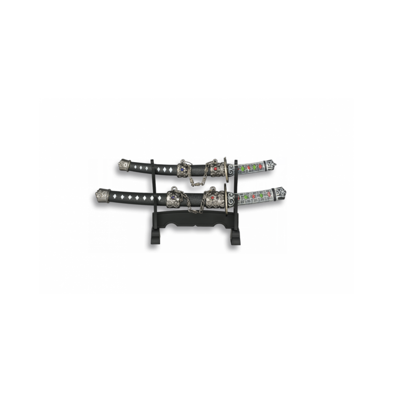 Marke: TOLE10 Imperial<br />Set mit 2 Mini-Katanas<br />Edelstahl<br />Größen:<br />-Gesamt: 18,5 cm/ Blatt: 12 cm<br />-Gesamt: 15 cm/ Blatt: 9,5 cm<br />Inklusive Sockel<br /><br /><br />