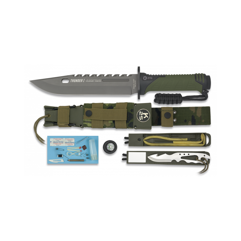 Urheberrecht ©<br />Entworfen in Spanien<br />Marke: RUI<br />Modell: THUNDER I<br />ENERGIE-SERIE<br />Taktisches Messer<br />Griff: Gummi-ABS<br />Klinge: Edelstahl. Titan-Beschichtung<br />Blattgröße: 20 cm<br />Klingenstärke: 5,5 mm<br />Gesamtgröße: 32,5 cm<br />Scheide
