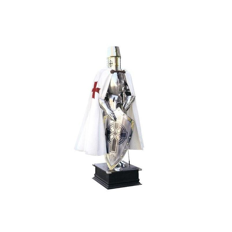 Die Farbe Weiß wurde im Mittelalter von den Tempelrittern des Templerordens auf Schilden, Fahnen und Bannern verwendet, die ihre religiöse Berufung symbolisierten. Die Farbe Rot wurde für die Farbe des breitarmigen Kreuzes verwendet, das auf ihre Wappen, Fahnen und in die Mitte der Brust gestickt wurde. Rotes Kreuz, verliehen von Papst Eugen III. als Zeichen gegen den Kampf gegen die Ungläubigen. - Mittelalterliche Templerrüstung, die die im dreizehnten Jahrhundert verwendete Rüstung simuliert. - Mittelalterliche Rüstung: Funktional und beweglich. - Hergestellt aus verzinktem Kohlenstoffstahl. - Details und Zeichnung des Kreuzes Säuregravuren. - Höhe 2 Meter. - Gewicht 45 kg. - Inklusive Baumwollumhang mit dem Templerkreuz in Rot und Schild mit dem Templerkreuz. - Enthält auch einen Holzständer.