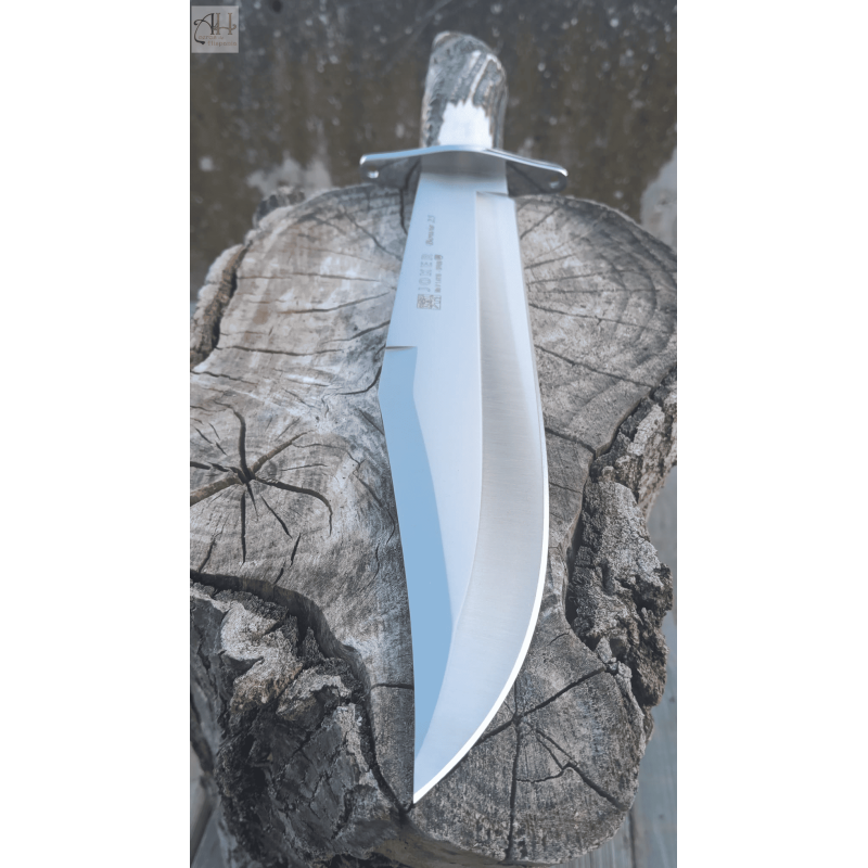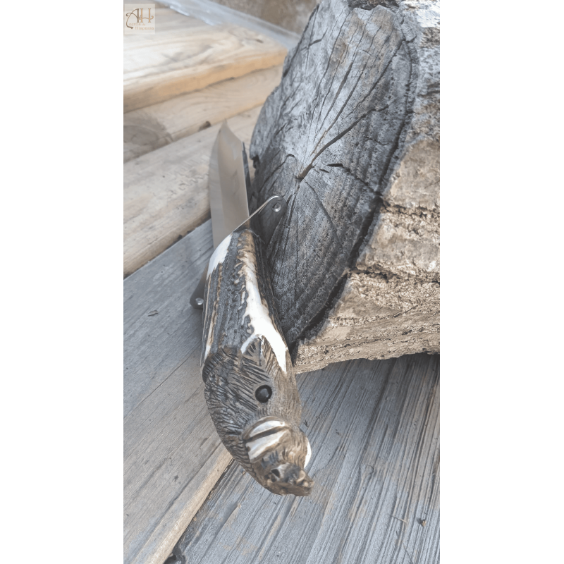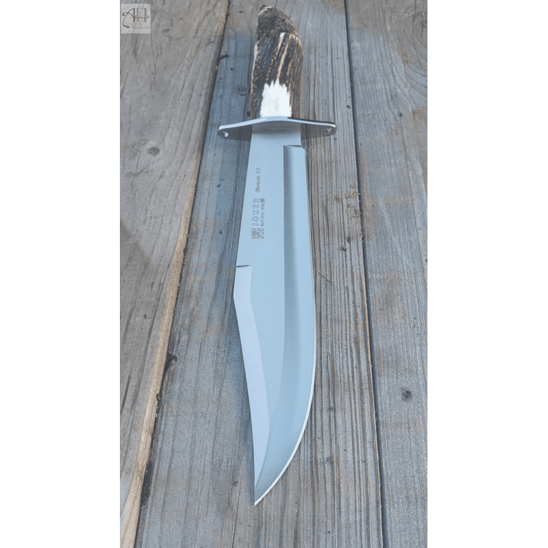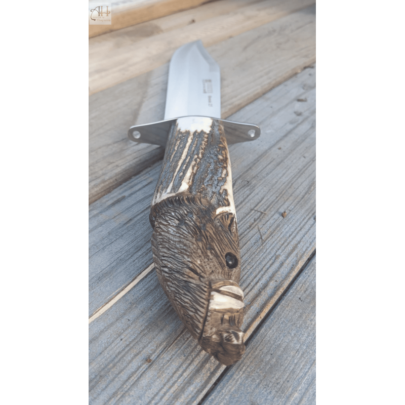 Der Griff aus handgeschnitztem Hirschhorn zeichnet sich durch seine detaillierte Verarbeitung aus, die jedes Stück zu einem einzigartigen und unwiederholbaren Werk macht. Die Klinge aus rostfreiem MOVA-Stahl 1.4116 garantiert Langlebigkeit und Stärke mit einer Härte von 55-57 HRC.