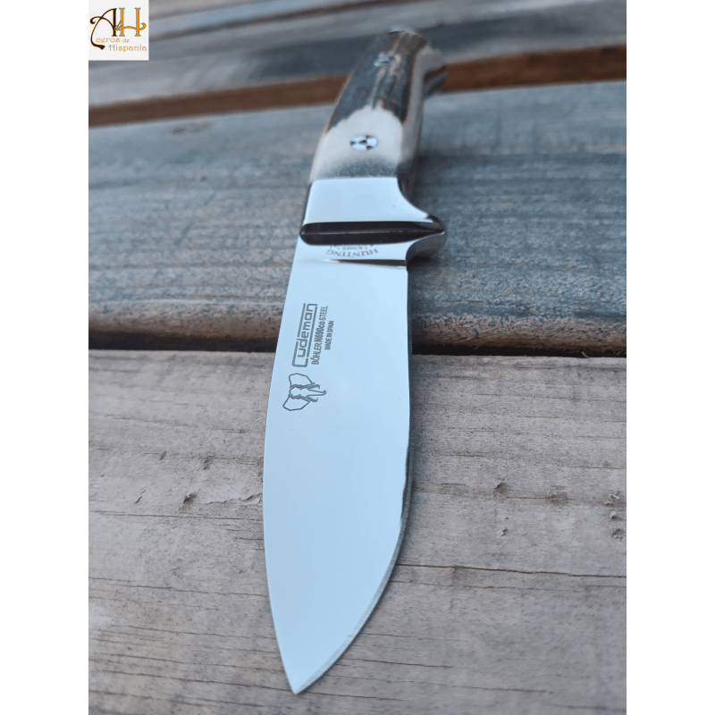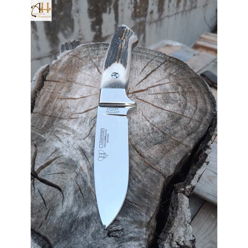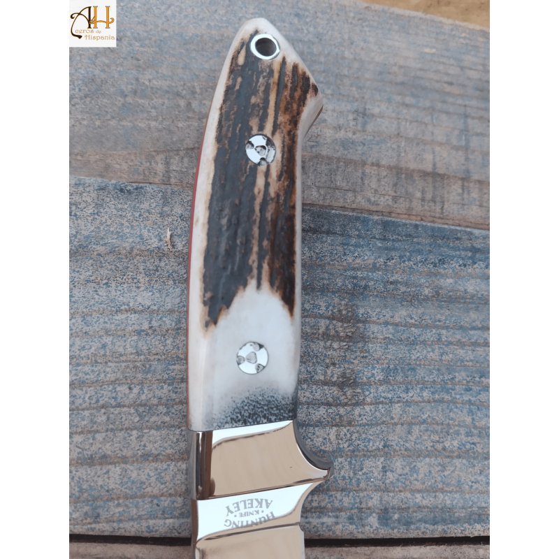 Cudeman full tang hunting knives, model 254-C Akeley is a sporting knife. It has a 10 cm blade made of N690CO BÖHLER steel of hardness 60 HRc, with a blade thickness of 4 mm. It has a Drop-point blade tip and a polished finish. The handles are polished stag with red spacer.