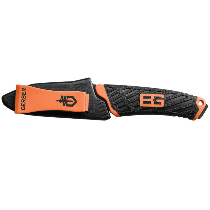 Compact and indestructible, this knife was designed to be the survival tool that stays close at hand. A durable rubber handle is ergonomically shaped for better grip; the handy partially serrated blade is housed in a plastic sheath that can clip anywhere.
