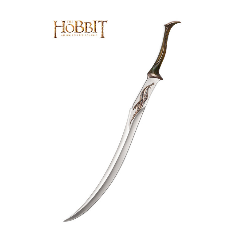 The infantry soldiers of the Forest Black Forest Guard, who have promised to watch over the great Black Forest, the kingdom of Thranduil. These mortal warriors are adept at dealing with different weapons, including the bow and the sword. The Black Forest Sword is an elegant and deadly infantry sword with Elbischem Design. It consists of a grip with both hands and a silvan itself forged steel blade that was elaborately decorated with designs that flow elvish. This replica of United Cutlery is a beautiful collector's item. The sword has an extreme handle composed of cast metal elements in bronze finish and a stainless steel blade with molten metal trim. The package includes a wooden wall screen (including mounting material and installation instructions) with Waldelb graphic pattern, and a certificate of authenticity. Details: