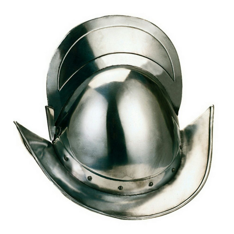 Capacete is a Renaissance helmet, open, resulting from the iron capillo and similar to the morrión, from which it derives the name of Spanish morion that was given to it in England.<br /><br /> But it was more spherical than that, flat or flattened, and resembling half an almond shell, 1 with broad, drooping wings.<br /><br />