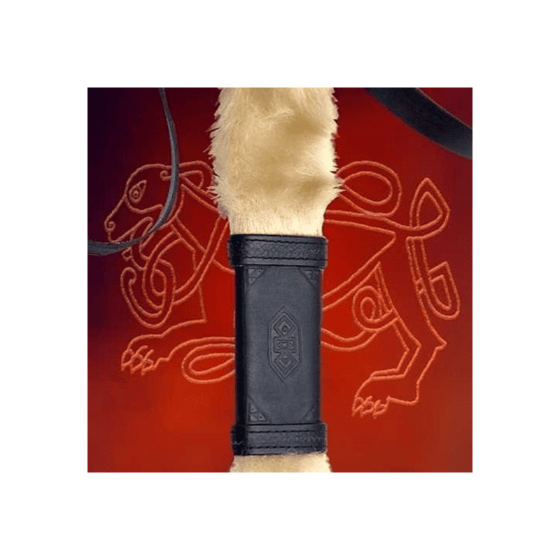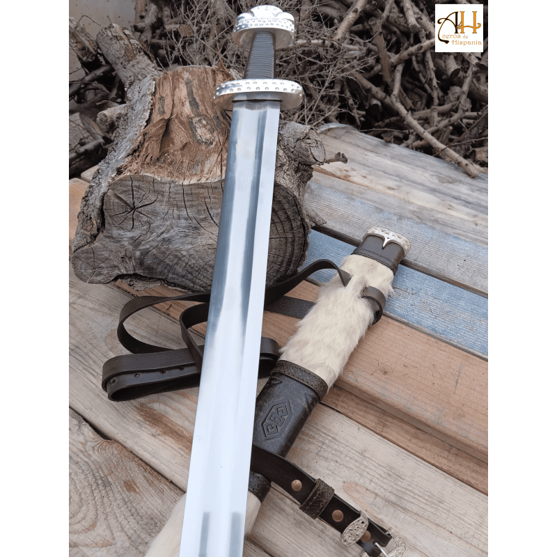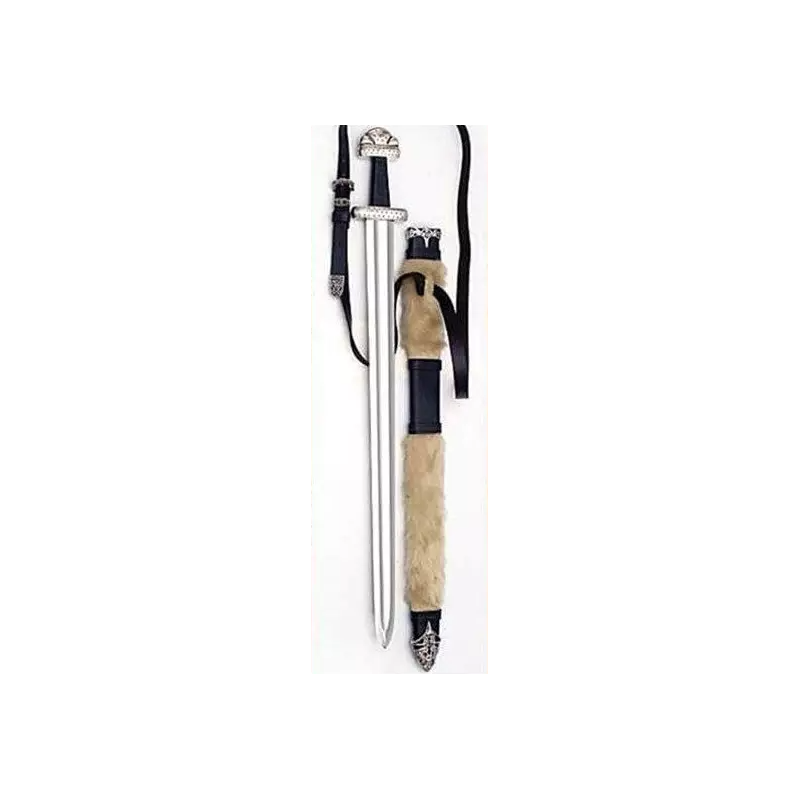 The scabbard is wood covered in rich harness grade leather with embossing and covered in faux reindeer fur.
