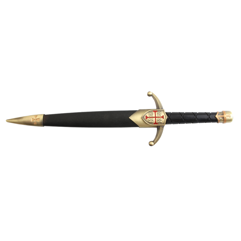 Templar dagger 16759-2 the knob and the guard are bronze with the handle in black, the knob has the details of the helmet in gold. The total size is 40.5 cm of steel blade The sheath is black with bronze finishes.Ref. 16759-2