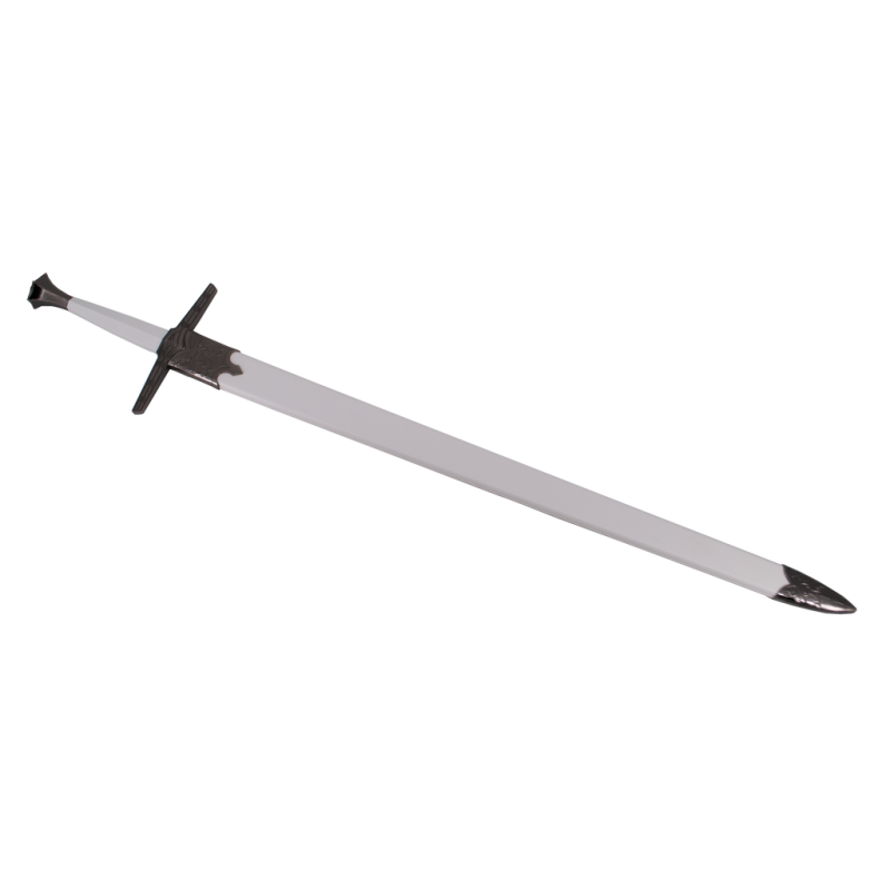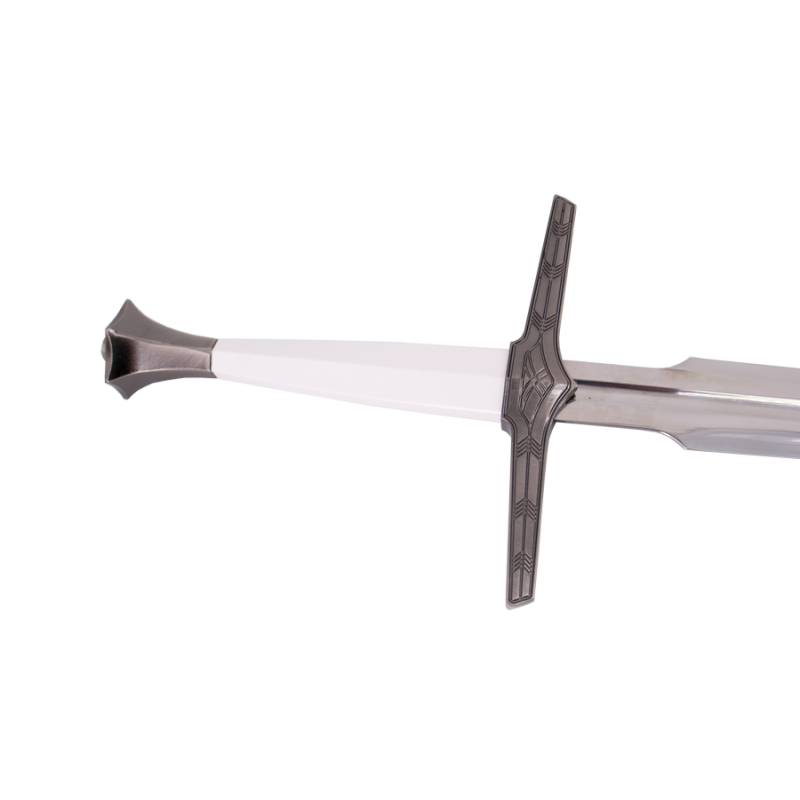 Sword S0251 Model of the silver sword of Geralt de Riva (The Witcher), Unofficial replica, it is the model that appears in the Netflix series. With a total size of 121.5 cm, with the cross in nickel color with decorations and handle in white, steel blade and white leather sheath.Ref. S0251