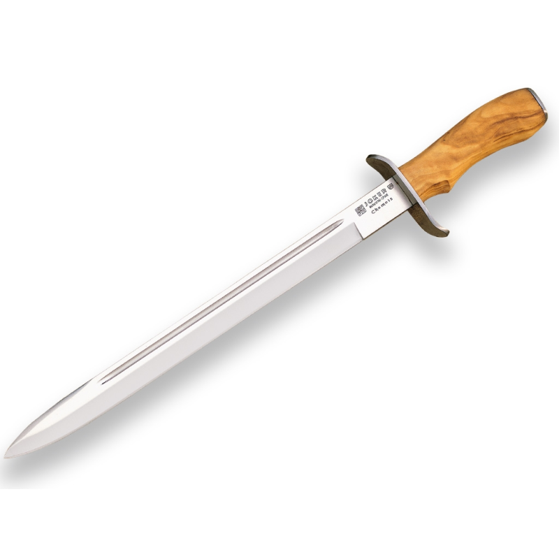 Hunting knife model Chamois, has a blade of 33 cm long, with a satin finish, its tip is Drop Point, with a blade width of 2,5 cm and a blade thickness of 5 mm. It is made of Molybdenum Vanadium steel with a hardness of 56-58 HRc. It is a sporting knife used for hunting, and highly valued by hunters in Central Europe.