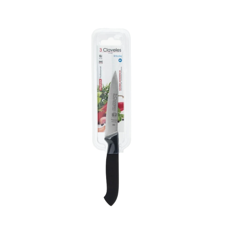 <p>- Knife for vegetables.<br />- Stainless steel.<br />- Polished dull.<br />- Slightly rough surface, non-slip handle, safer use.<br />- Handle color: black.<br />- Ergonomic design.<br />- No wet absortion, light and resistance.<br />- Resist sudden temperature changes.<br />- High quality plastic.<br />- Higienic surface.<br />- High performance.<br />- Long life resistance.<br />- Presented with blade sheath.</p>
