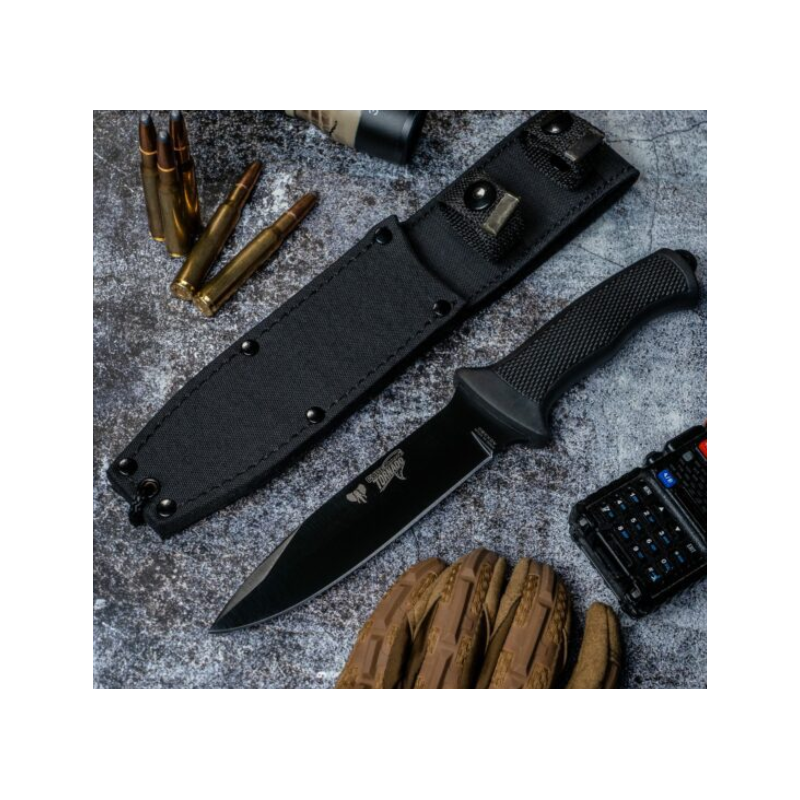 - Black rubber with a checkered grip handle. - 440 steel black blade. - Black cordura sheath included.