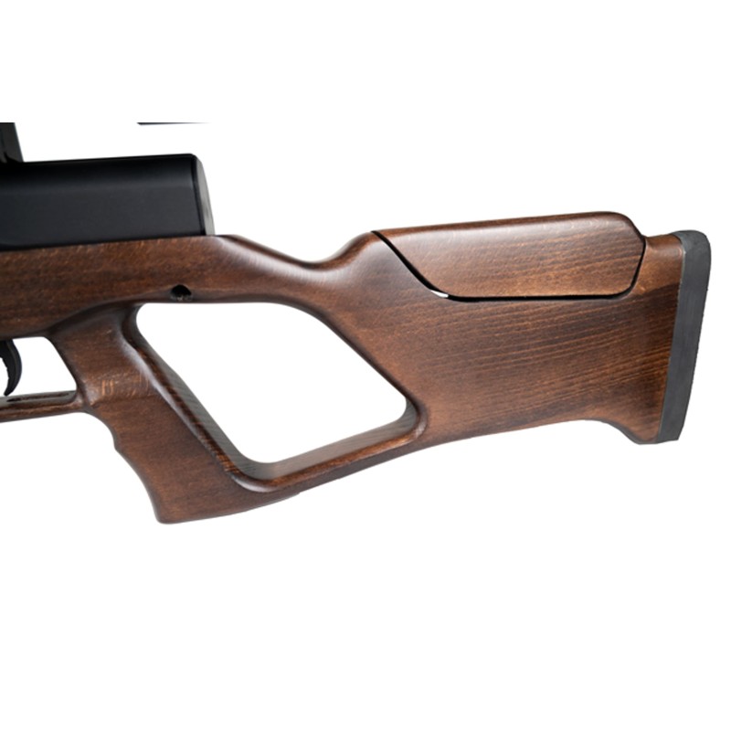 Its ergonomic design includes an adjustable wooden stock and rubber butt pad for comfort.