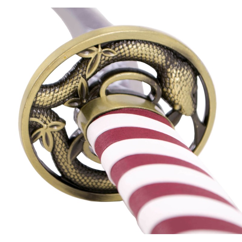 <p>Demon Slayer Katana wielded by Obanai Iguro unofficial replica of 71 cm steel blade finished in worn black with red cut, handle with maroon and white leatherette strings, tsuba with two snakes, black leatherette scabbard.</p>