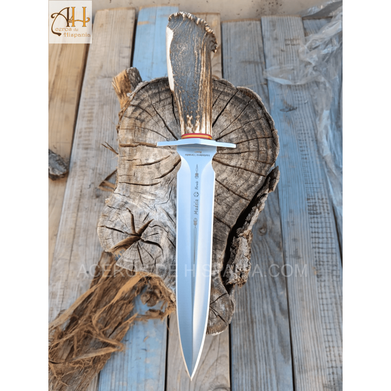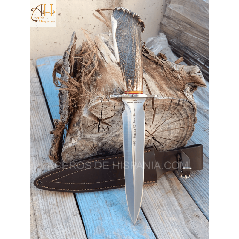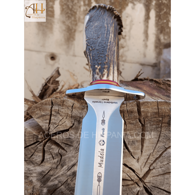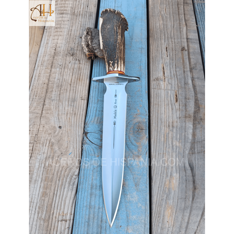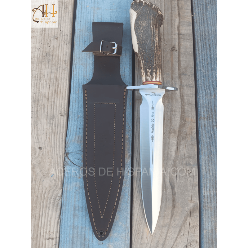 The Mudela VARETO-23 finishing knife stands out for its robust design and elegant stag horn handle with rosette and flag. Equipped with a MoVa 380 stainless steel blade, it is designed for big game hunting. Its size and balance make it efficient and handy. It includes a highly resistant leather sheath.