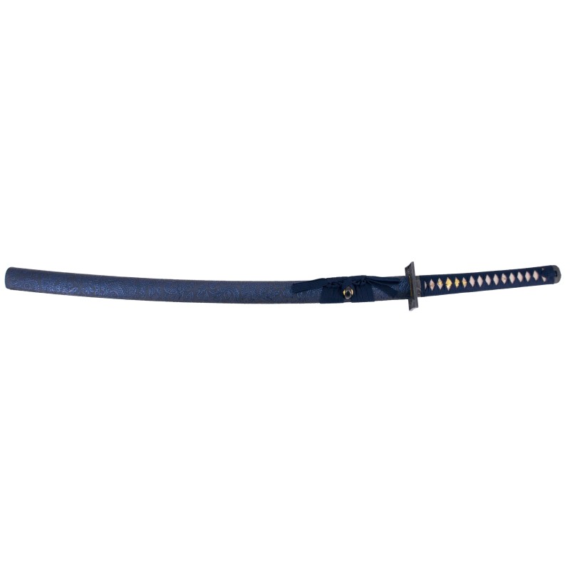<p>Functional Katana 104 cm blue damascus steel blade, wooden scabbard lined with blue decorated fabric, blue strung handle with genuine leather stripe. With stand. </p>