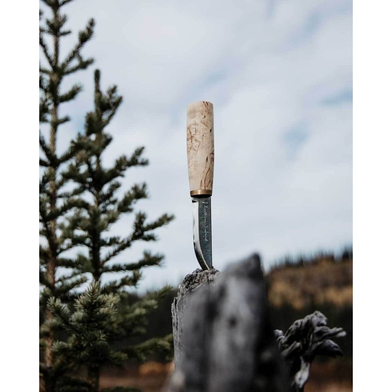 The handle is made of Finnish curly birch, and the knife is protected with a beautiful natural-colored leather sheath.