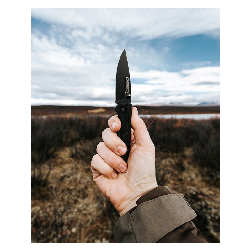 <p>The handle is made of G10 fiber-reinforced composite. The eight-centimeter blade locks into the open position using the Liner Lock system. The handle includes a belt clip, allowing you to carry the folding knife conveniently.</p>