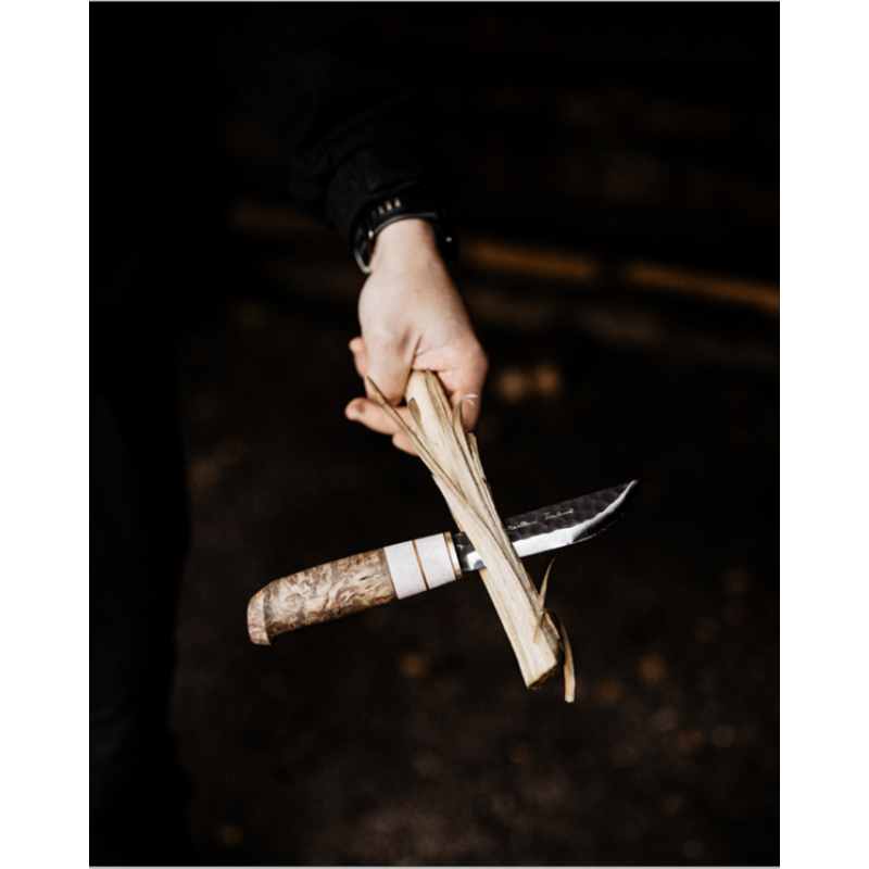 The bold Aapa knife embodies the rugged atmosphere of the Finnish marshland. This model combines the typical characteristics of two robust traditional knives: the blade of a classic Lappish knife and the handle of a Lynx knife. The blade is made of forged carbon steel. The handle is an earthy blend of tar-waxed curly birch and reindeer antler bone. The new sheath is wider.